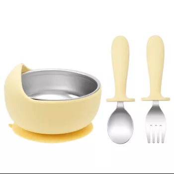 3PCS Baby Feeding Set – Stainless Steel & Silicone Suction Bowls with Fork & Spoon