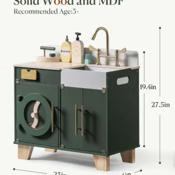 Vintage Green Wooden Toy Washer and Dryer Kitchen Playset for Kids